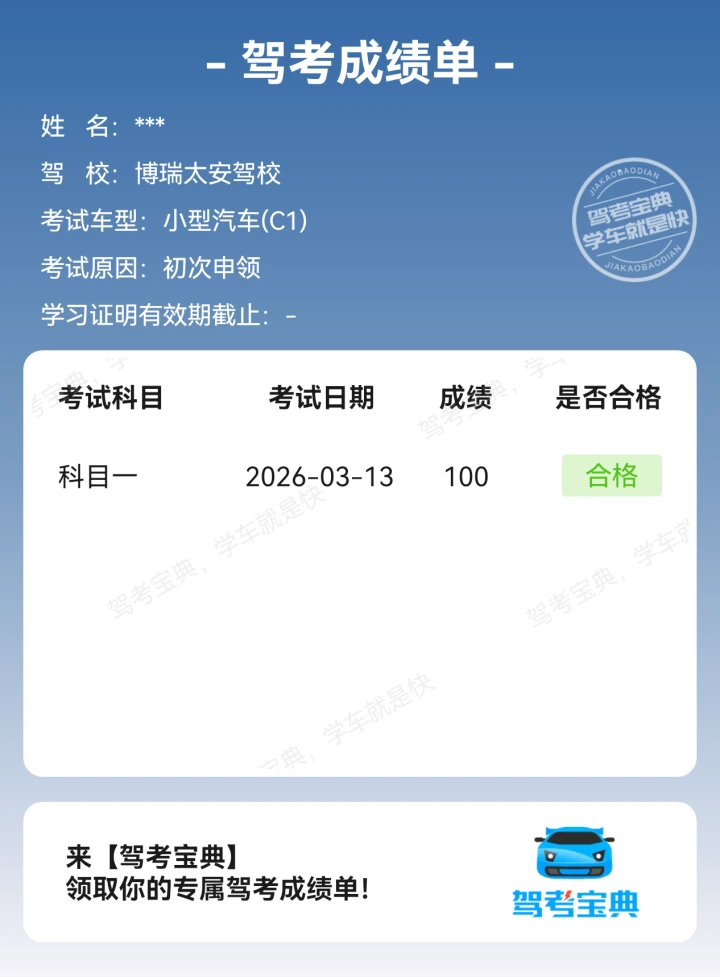 不辜负自己这么久的努力刷题,科目一已过,接下来就是踩油门,刹车啦