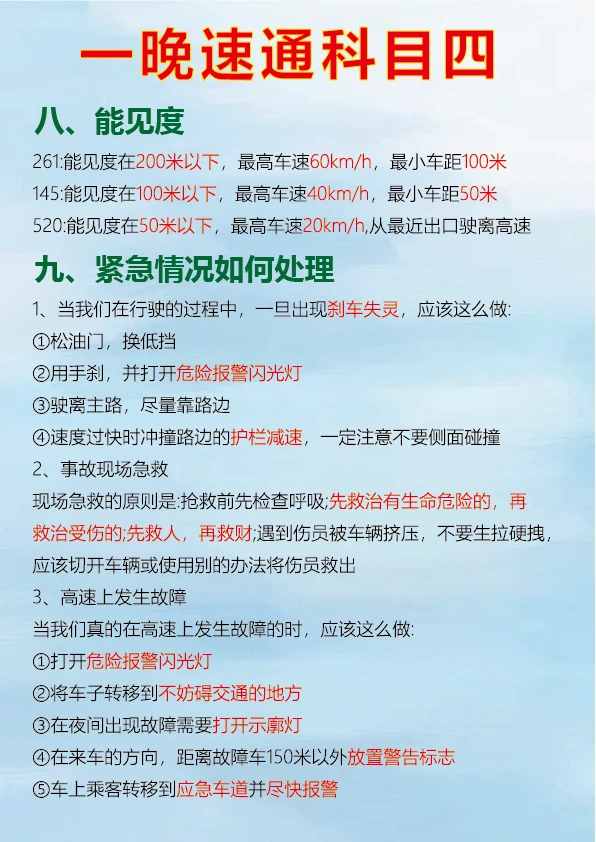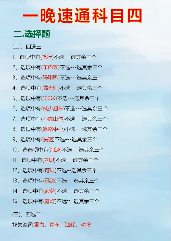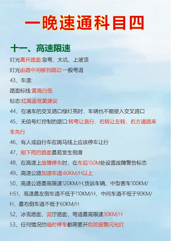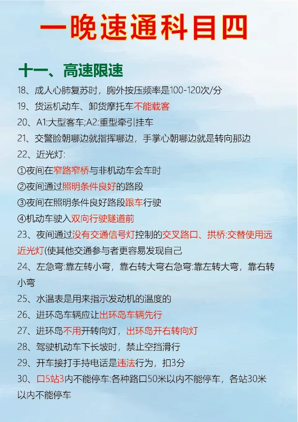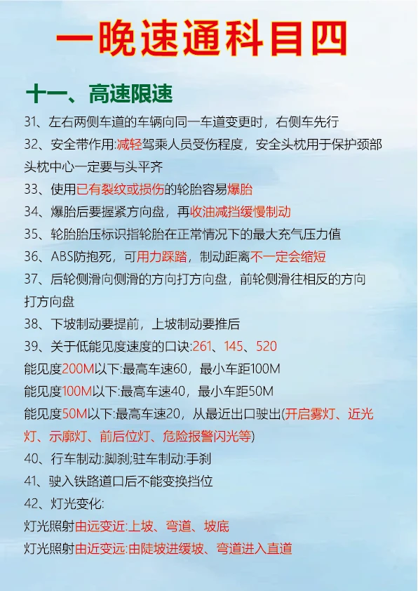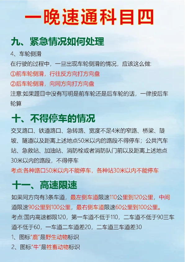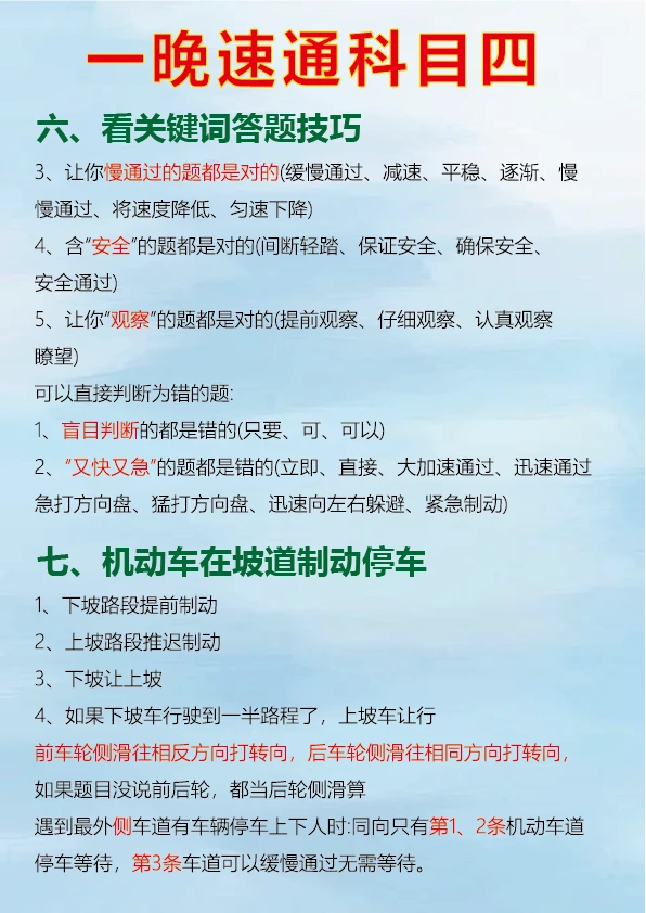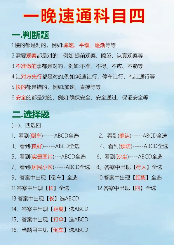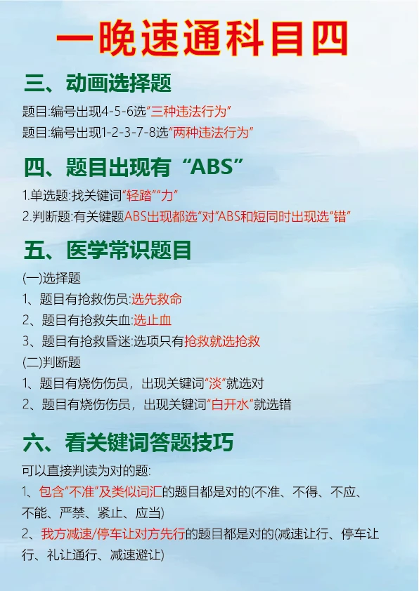 科目四速记口诀,背完真能过 科目四考试对于很多人来说是拿到驾照的最后一关,掌握一些肖肖速记口诀可以事半功倍。 判断题中看到 “不准、不得、不应该、严禁、禁止、应当” 等词一般为正确。 出现 “减速让行、停车让车、礼让通过、减速避免” 通常是正确的判断。 “缓慢通过、减速、平稳、逐渐、慢慢通过、速度降低、匀速下降” 等表述对应的判断题多为正确。 看到 “提前观察、仔细观察、认真观察、瞭望” 可判断正确。 多选题中要注意安全原则,如遇到紧急情况的处理、不同路况下的正确操作等。 只要牢记这些重点考点和速记口诀,再把驾考宝典的题目刷完,一晚备考科目四完全有可能通过。
